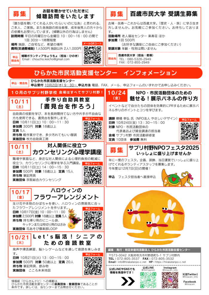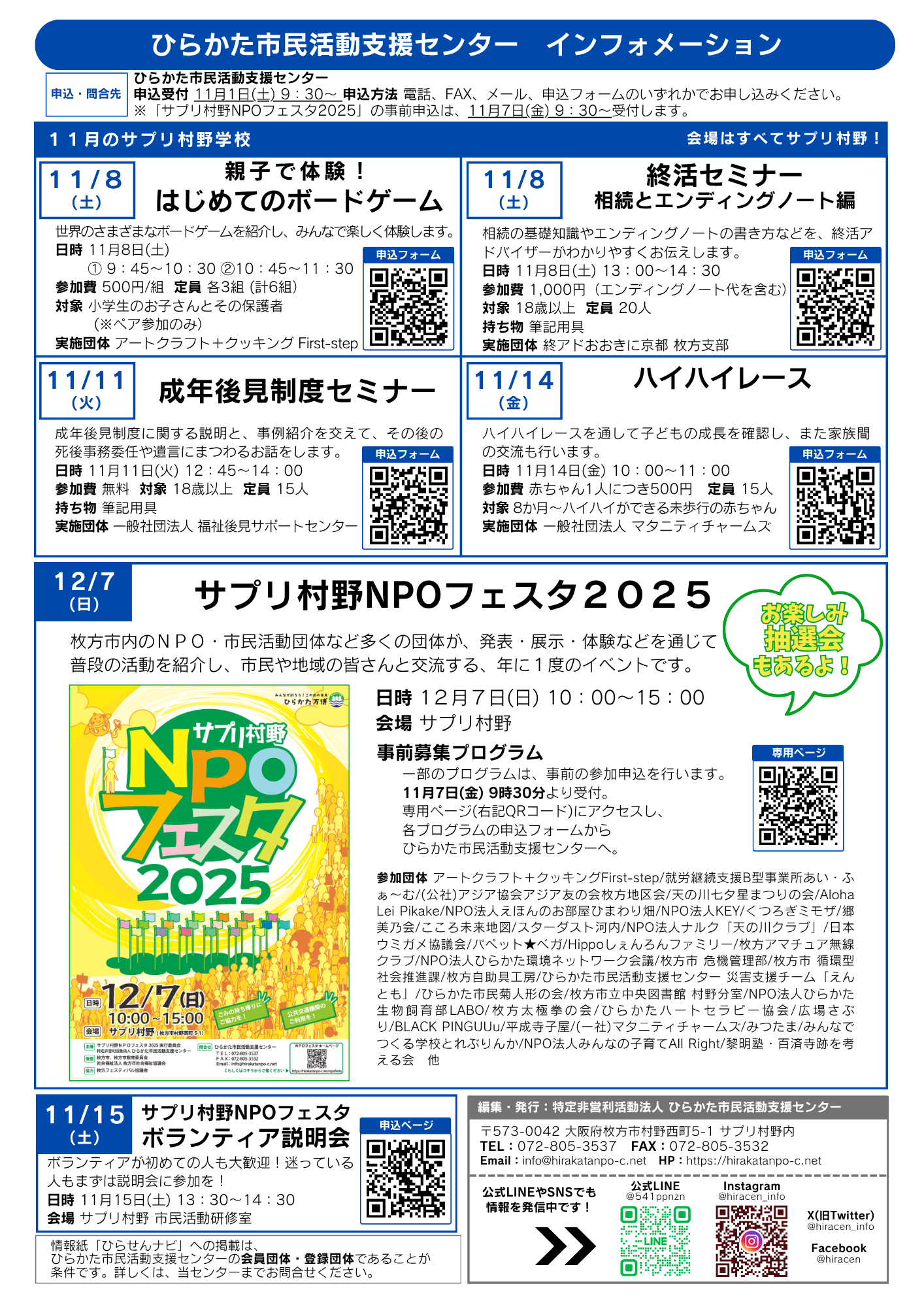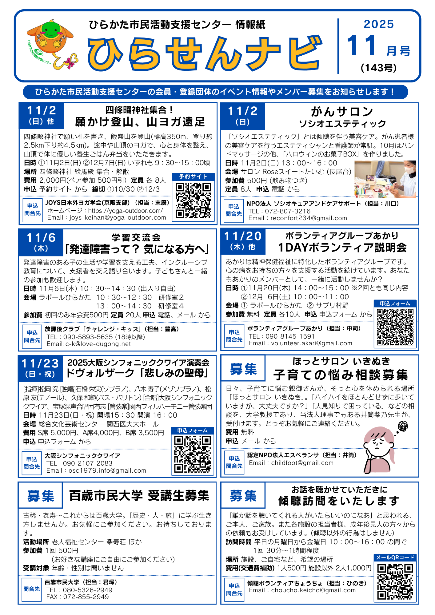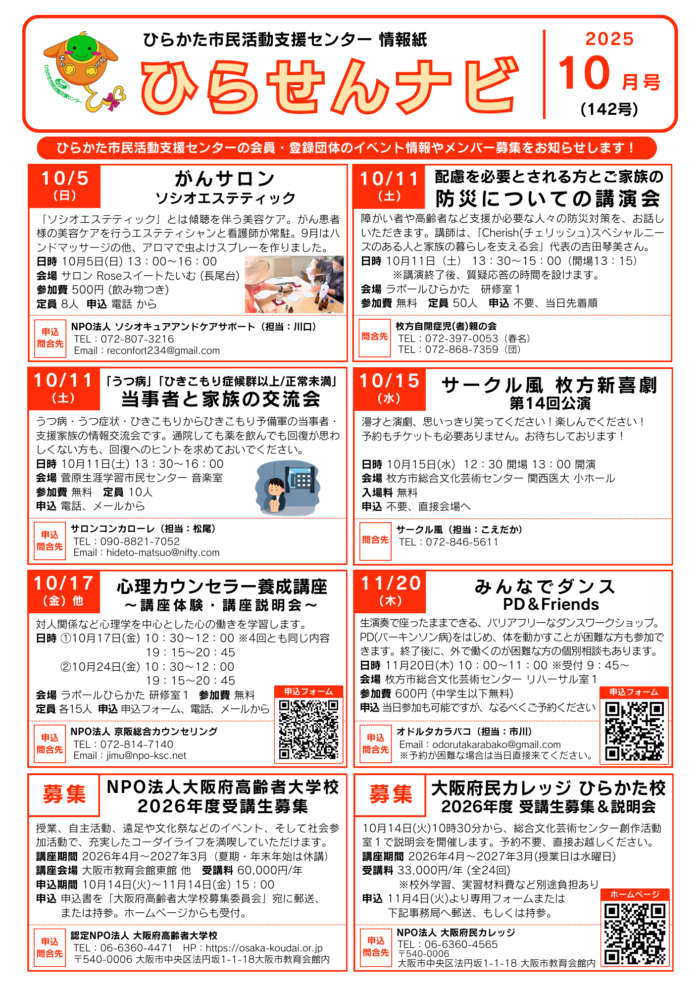 特定非営利活動法人ひらかた市民活動支援センターが、毎月1回、当センターの会員・登録団体のイベント情報、メンバー・ボランティア募集などの情報をお知らせします。